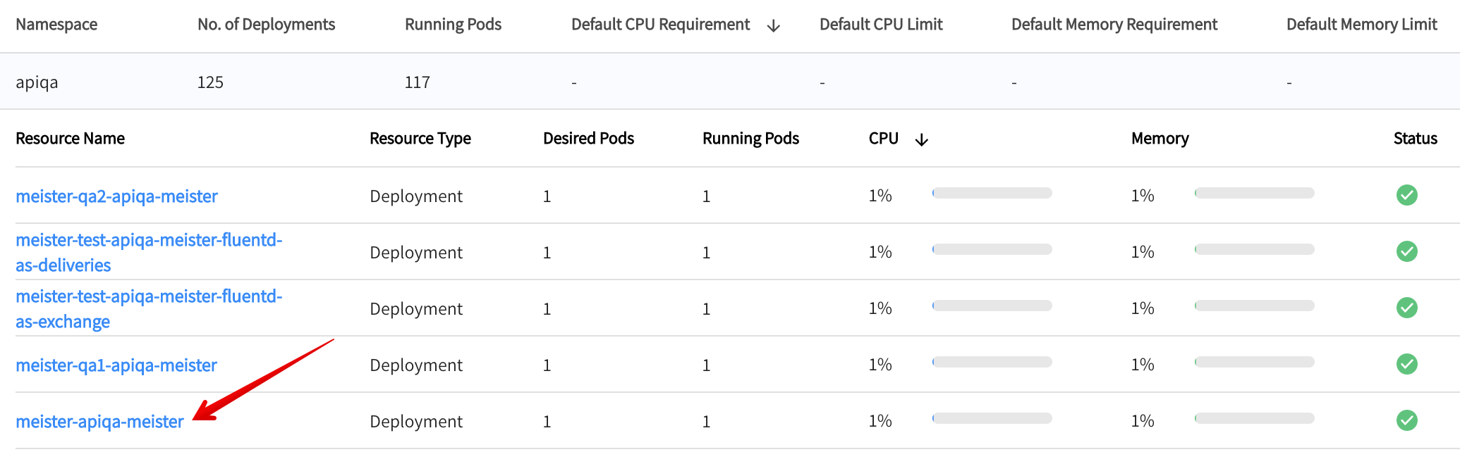 - Under Namespaces, click on the deployment (i.e., Resource) you wish to review to find CPU Utilization and Memory Utilization charts.